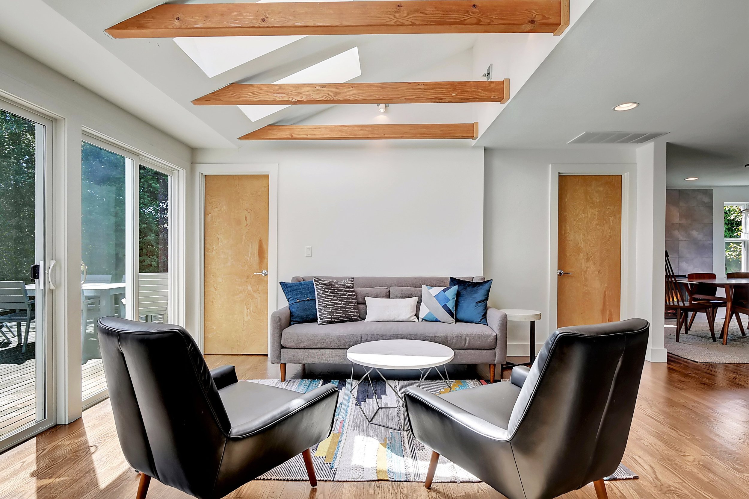 Shed roof above the new living room adds volume and space, while skylights and sliding glass doors in the kitchen and dining area let in extra natural light.