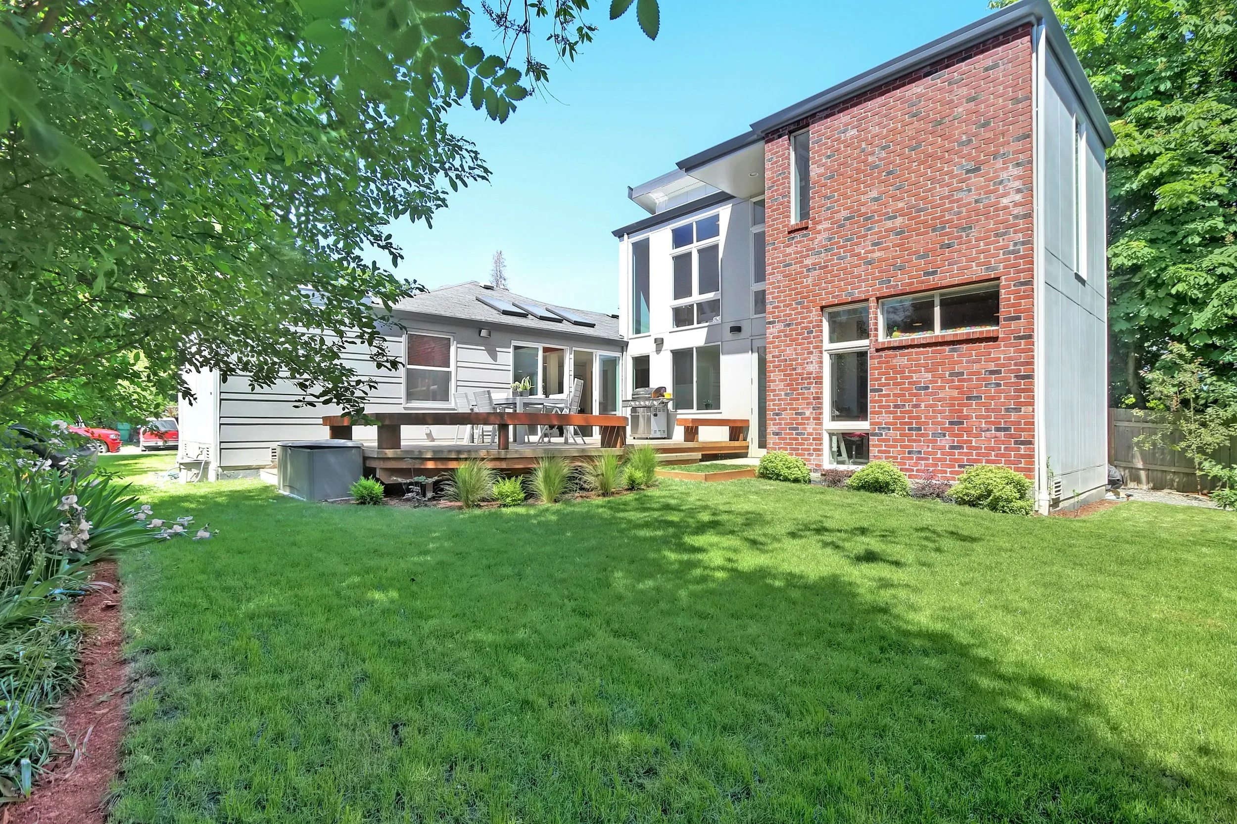 The addition features contemporary exterior with brick siding, an overhang shed roof and an at-grade covered patio space.